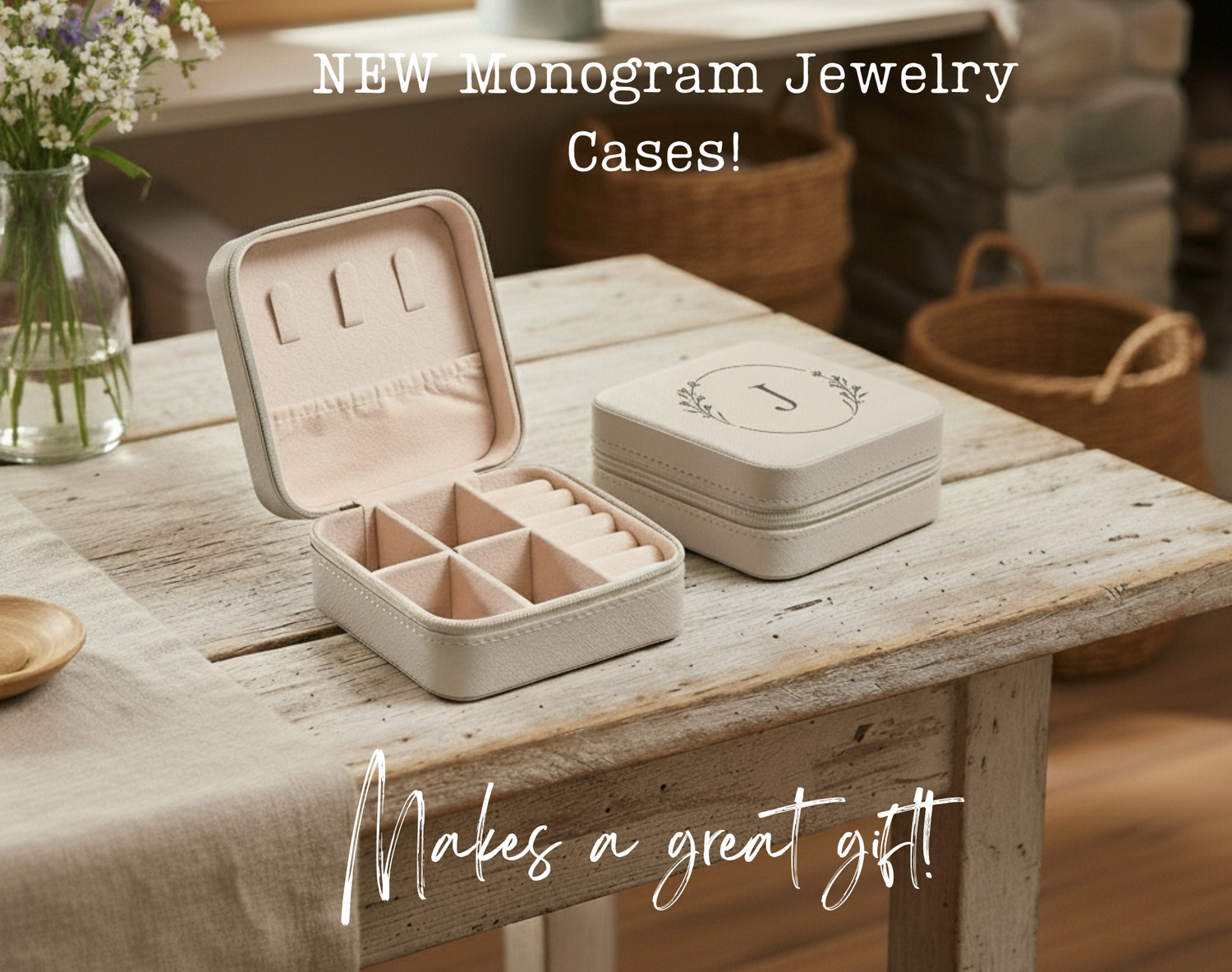 New! Travel jewelry cases personalized with your letter of choice! Available in ivory, gold or pink! Also available with my logo.