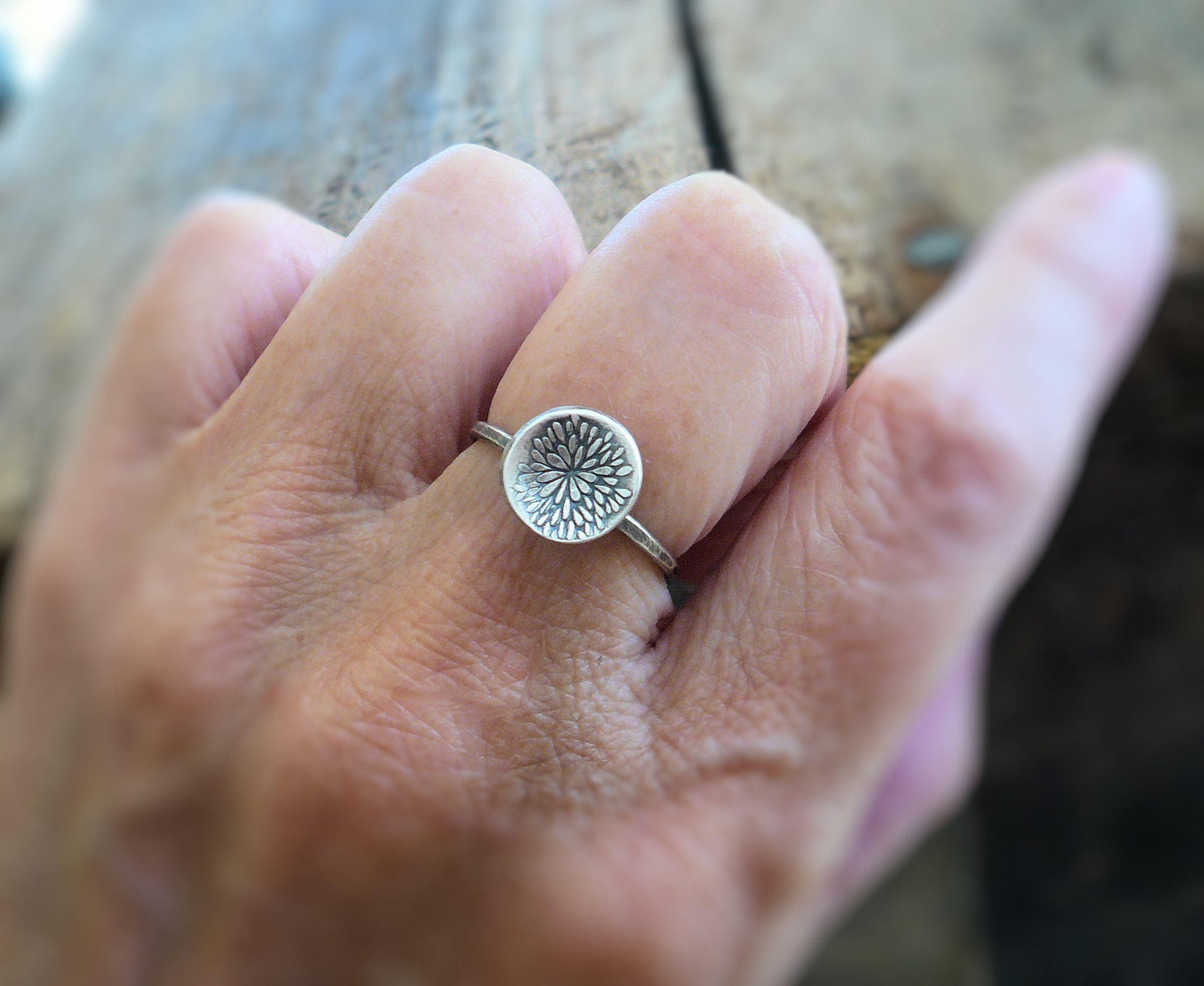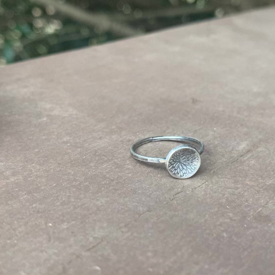 A ~10mm fine silver charm decorated with a sweet little bloom design & given a slight concave shape sits atop a hammered sterling band.