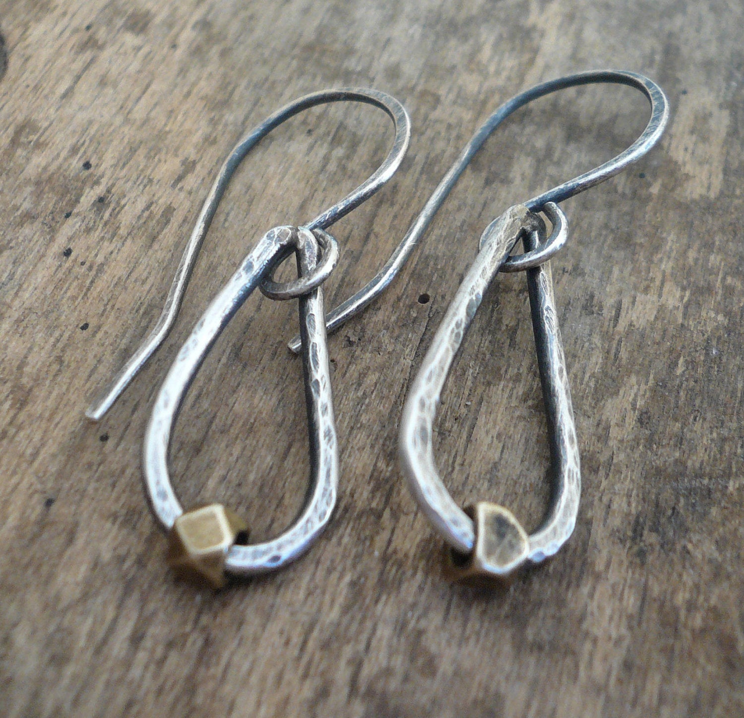 "Cosset" Antiqued nuggets of golden brass adorn my handforged, textured tear drops of sterling... Also available in a larger size in a separate listing.