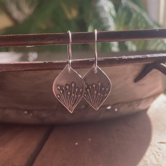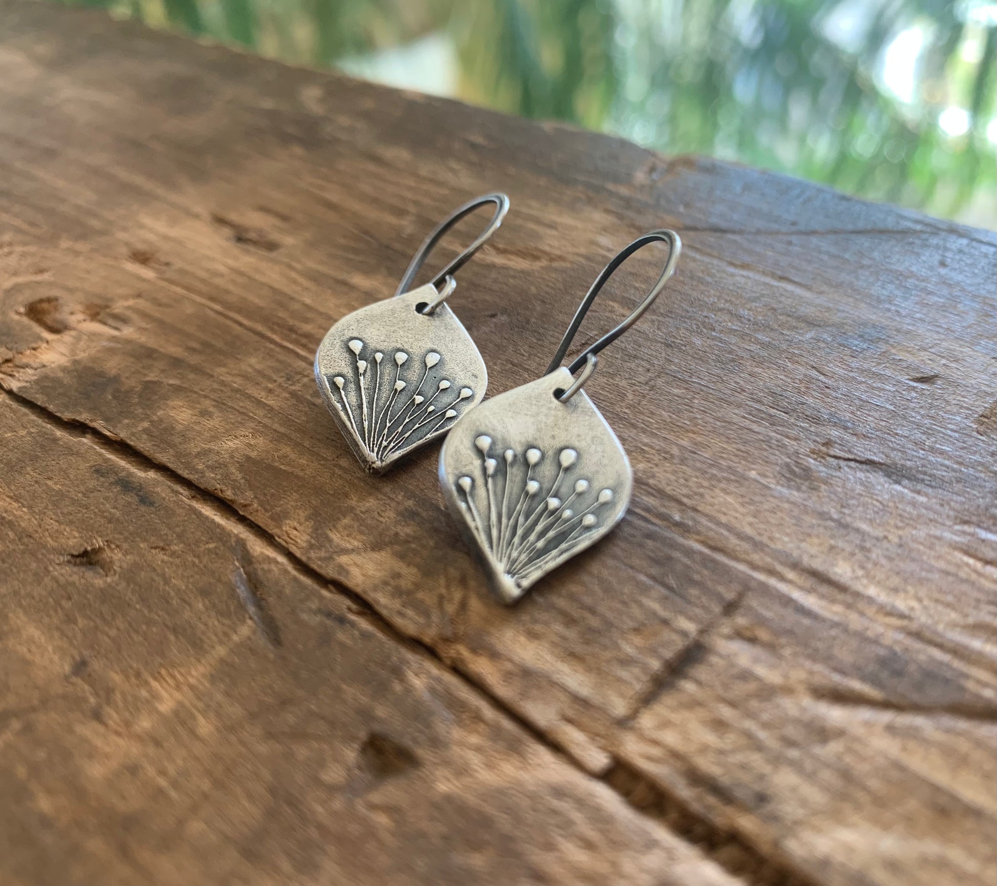 🧰 Approximately 21mm long by ~14mm wide irregular hand cut pods of recycled fine silver (99% pure silver/sterling is 92.5% silver) crafted by hand by me and imprinted with wispy little weeds.