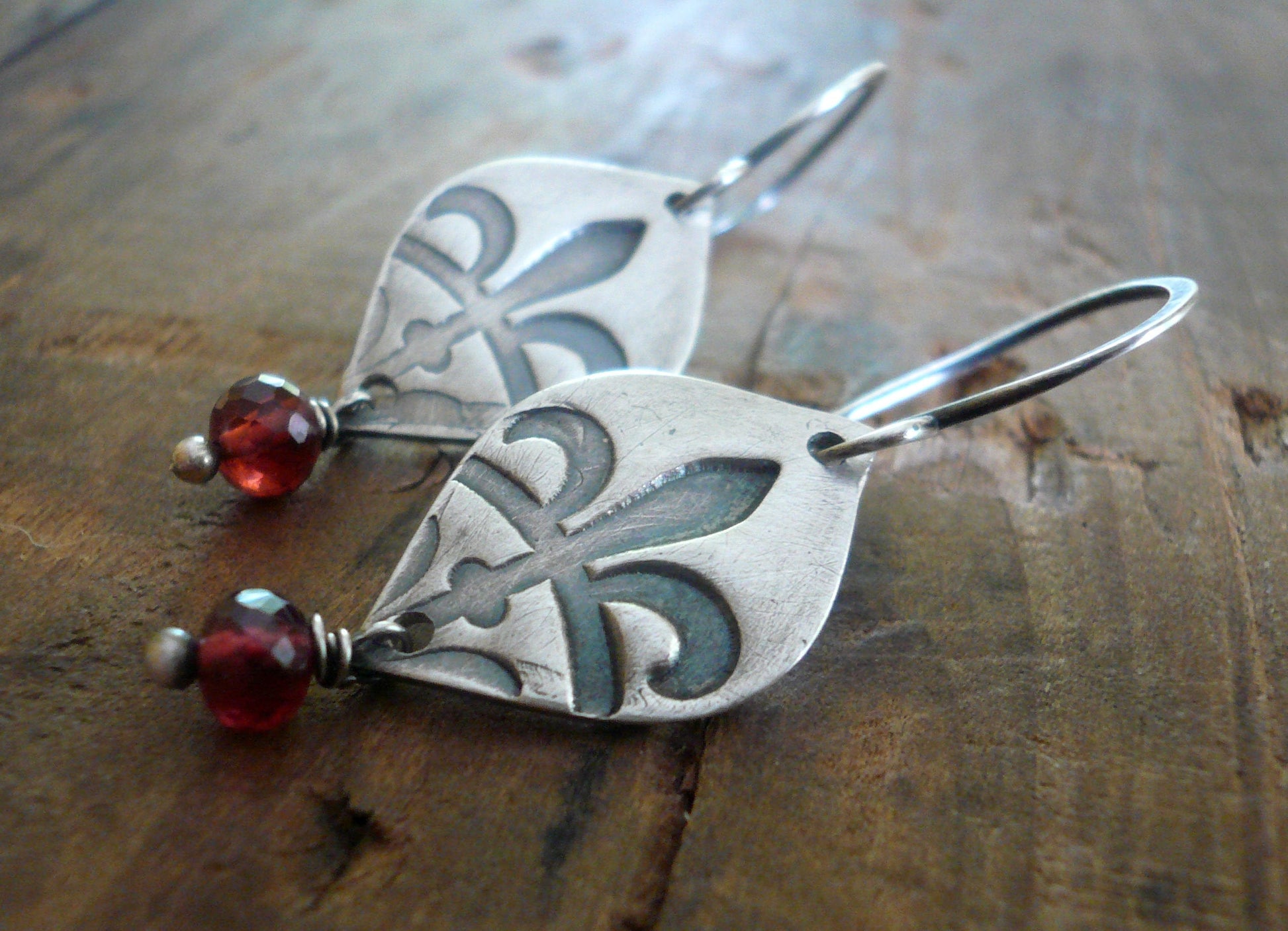 ~4mm faceted gemstone rondelles set on my handmade heapins dangle from my 20mm handcrafted charms imprinted with a Fleur De Lis .