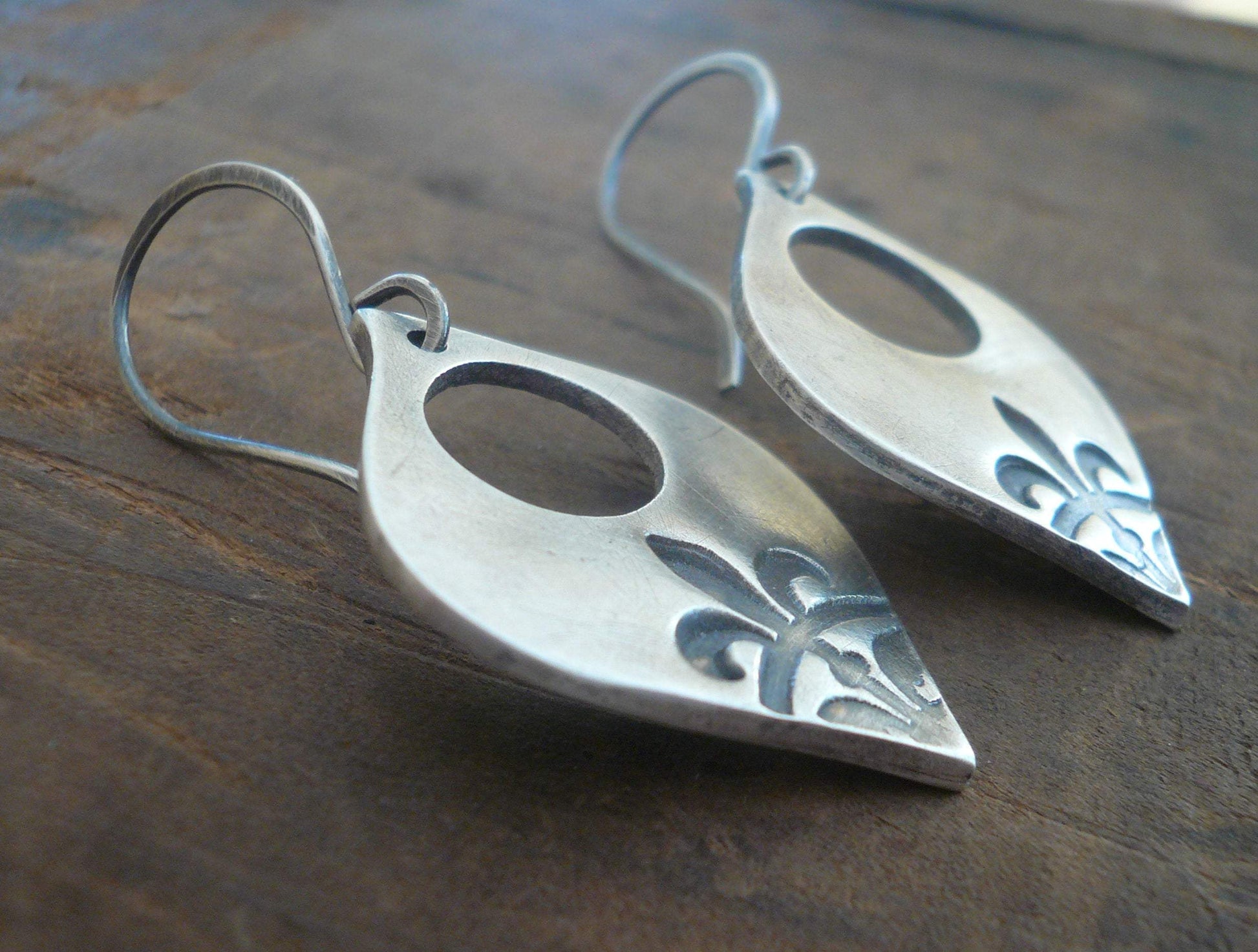 My 30mm handcrafted charms imprinted with a Fleur De Lis dangle from my handforged sterling silver earwires.