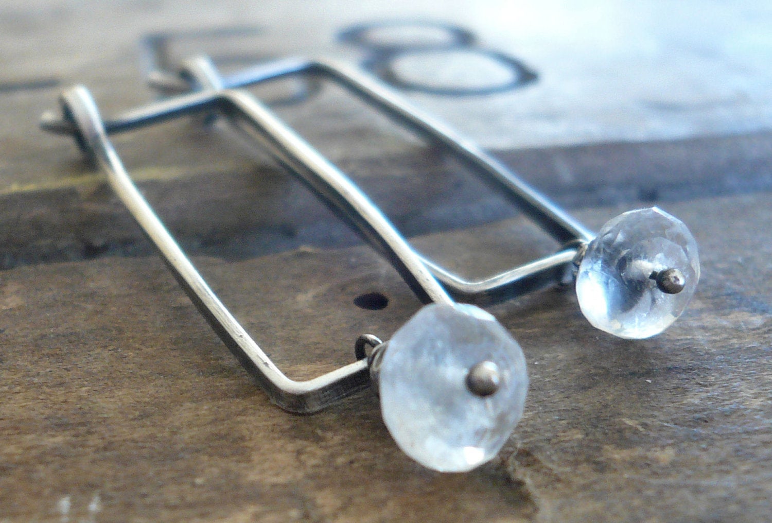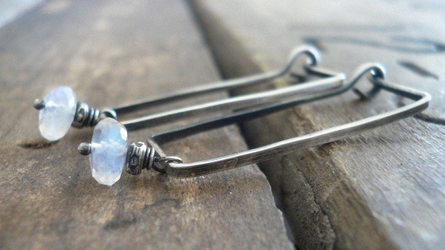 Elemental Earrings - Handmade. Moonstone. Oxidized Sterling Silver Rectangular Hoops