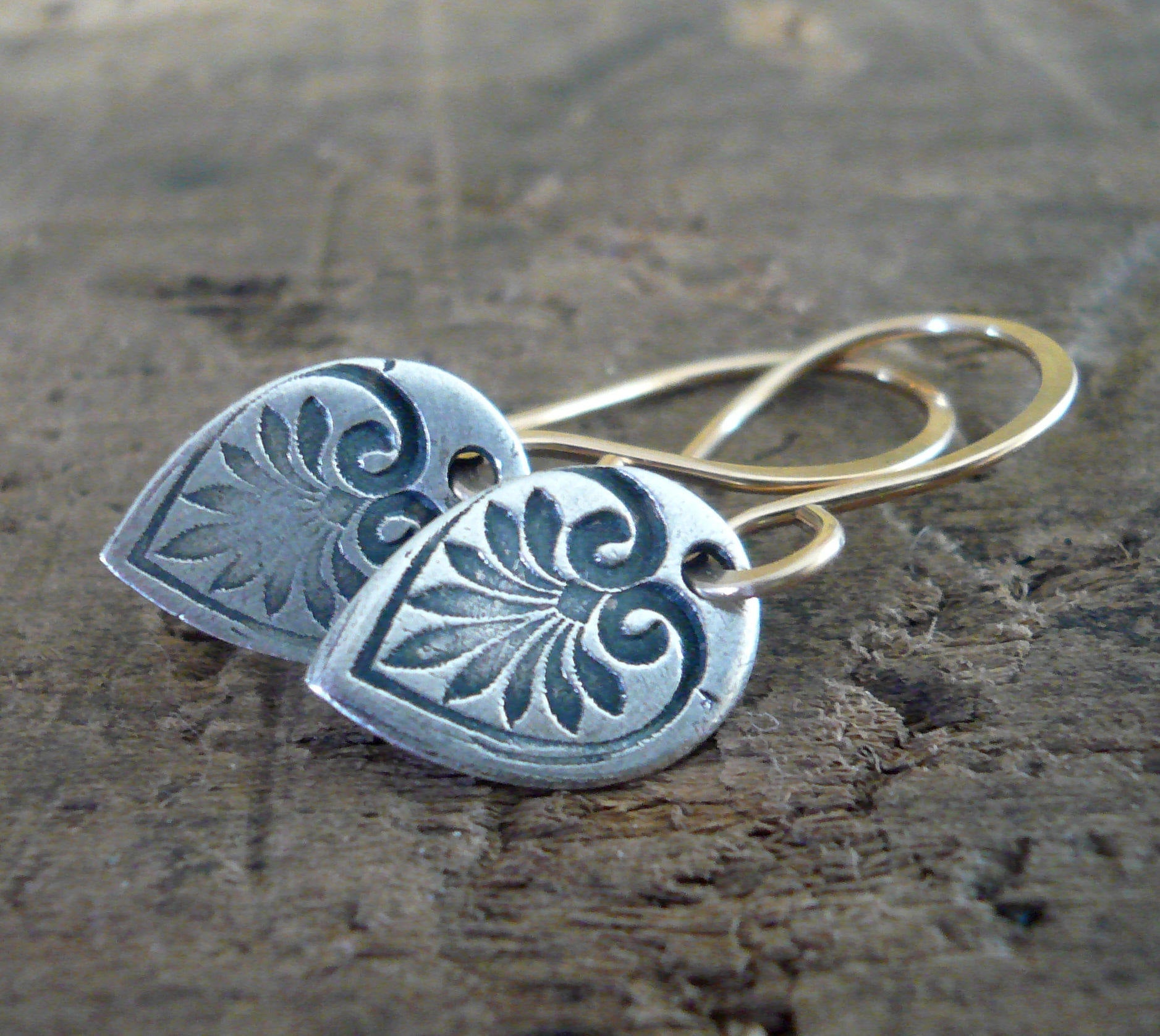 French Quarter Earrings - Leaf - Oxidized fine silver. 14kt Goldfill. Mixed Metal. Handmade
