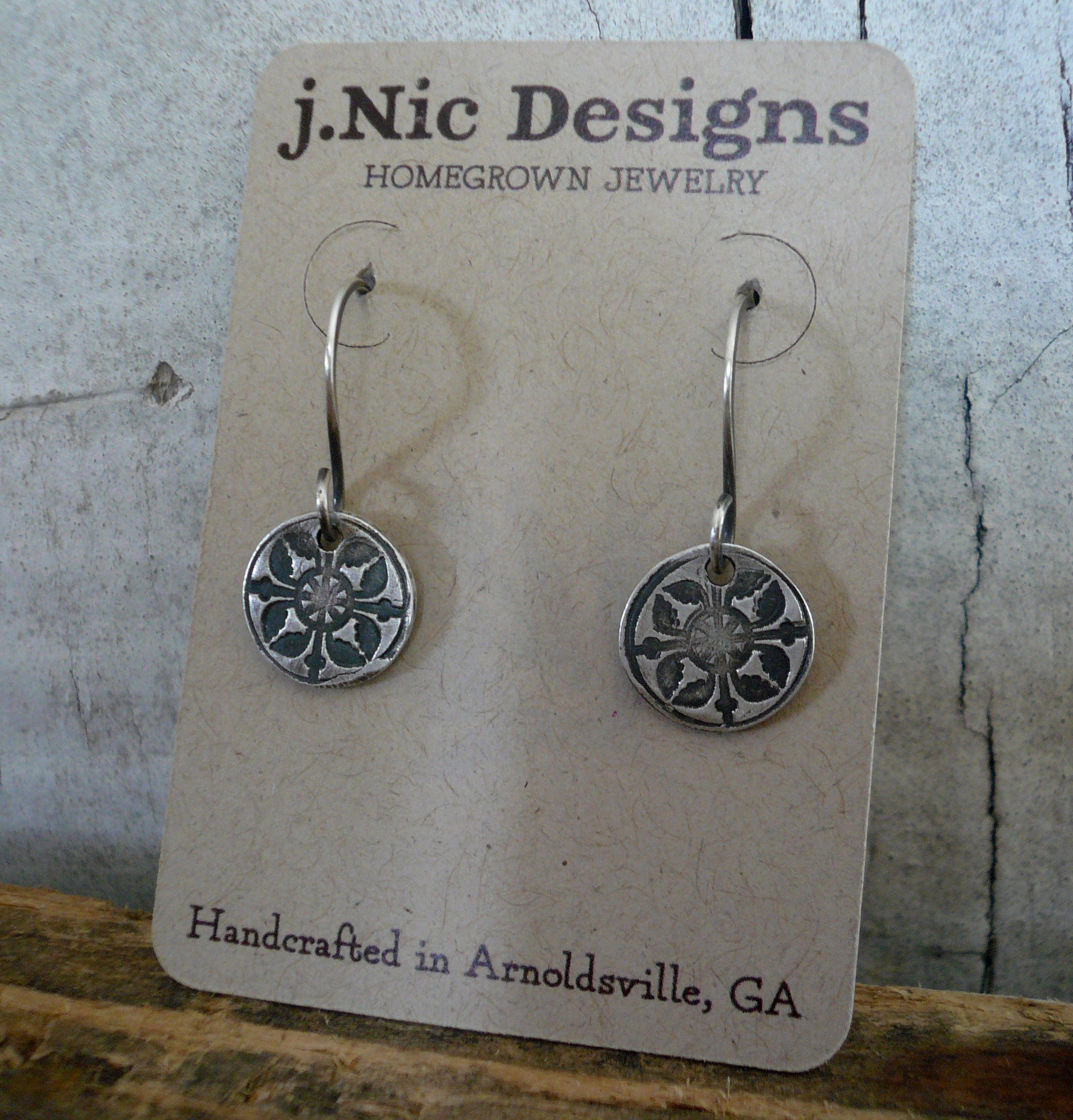 An oxidized patina was added layer by layer to the pendants then carefully removed by brushing & polishing by hand to add depth to the design & a bit of rustic appeal.