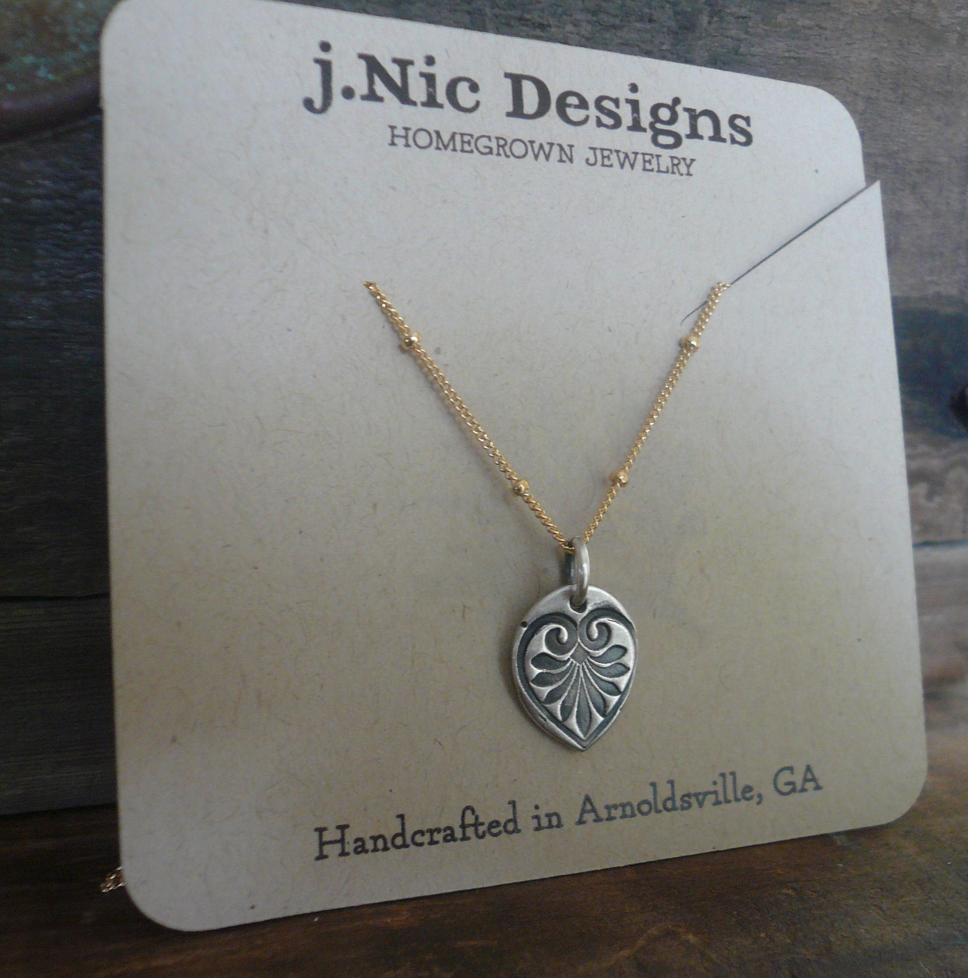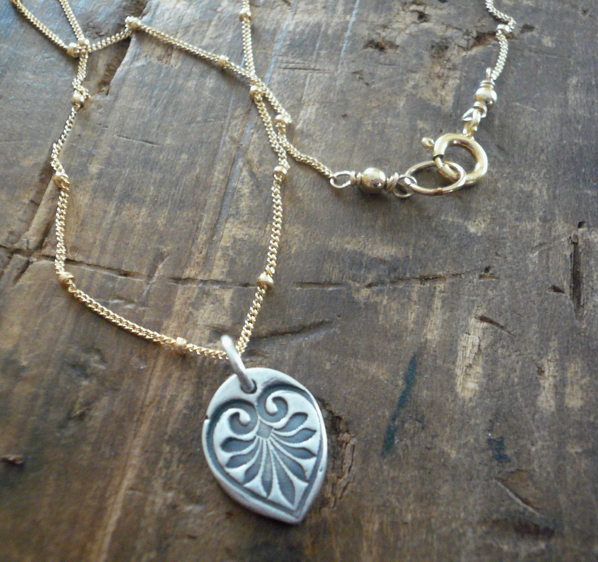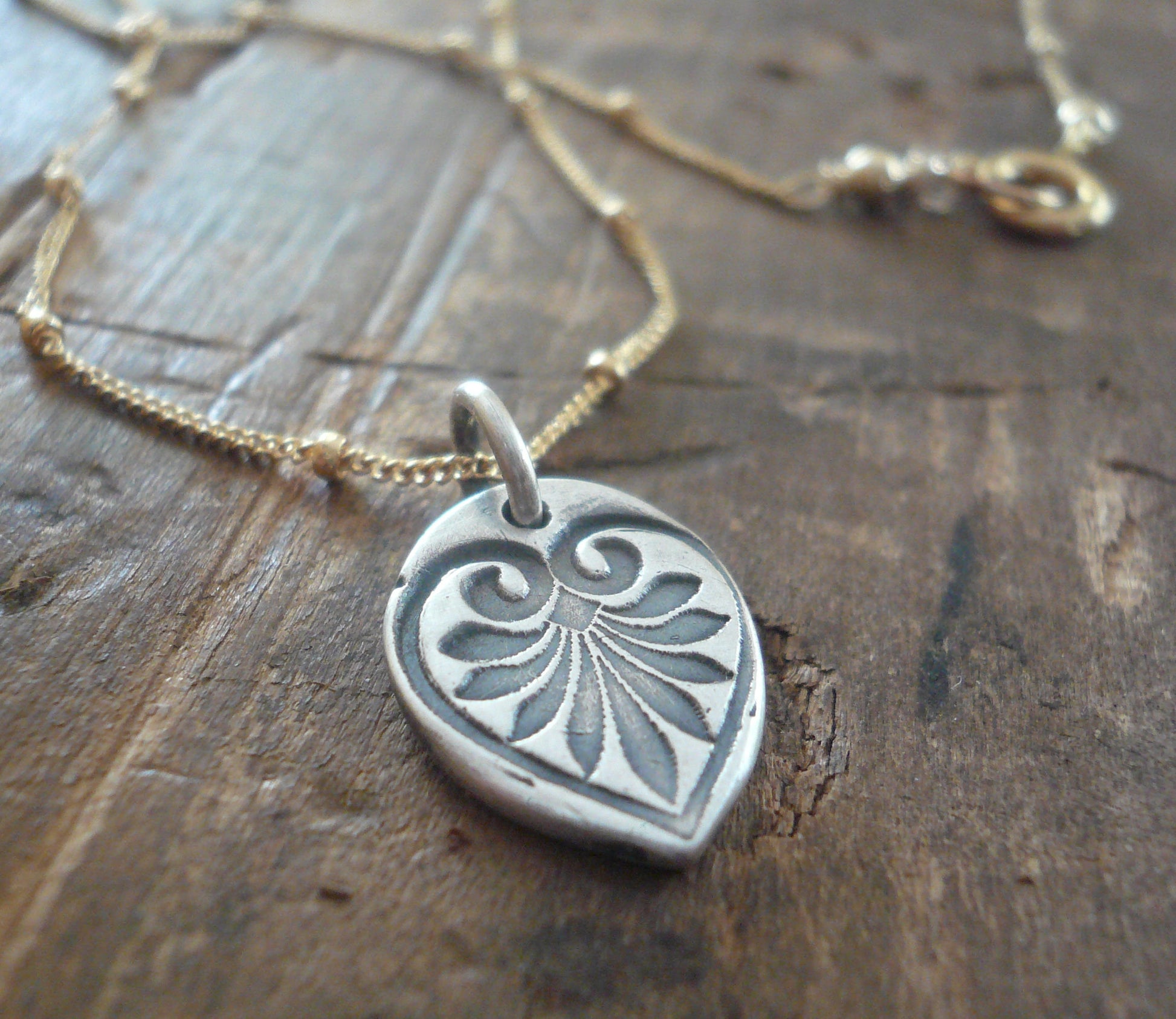 French Quarter Necklace -Leaf - Oxidized fine silver and 14kt Goldfill or sterling silver chain. Handmade