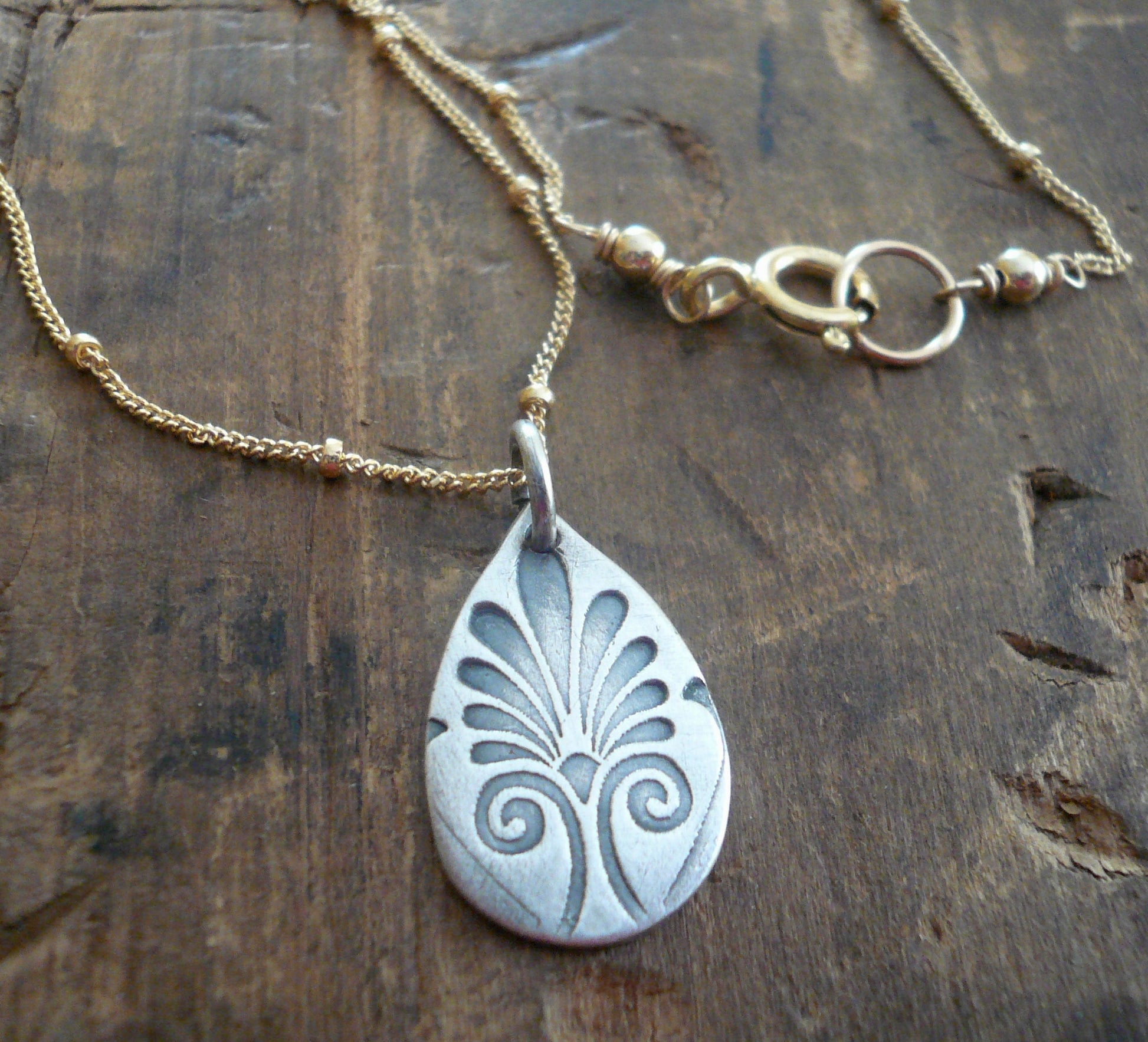 French Quarter Necklace -Tear- Oxidized fine silver and 14kt Goldfill or sterling silver chain. Handmade