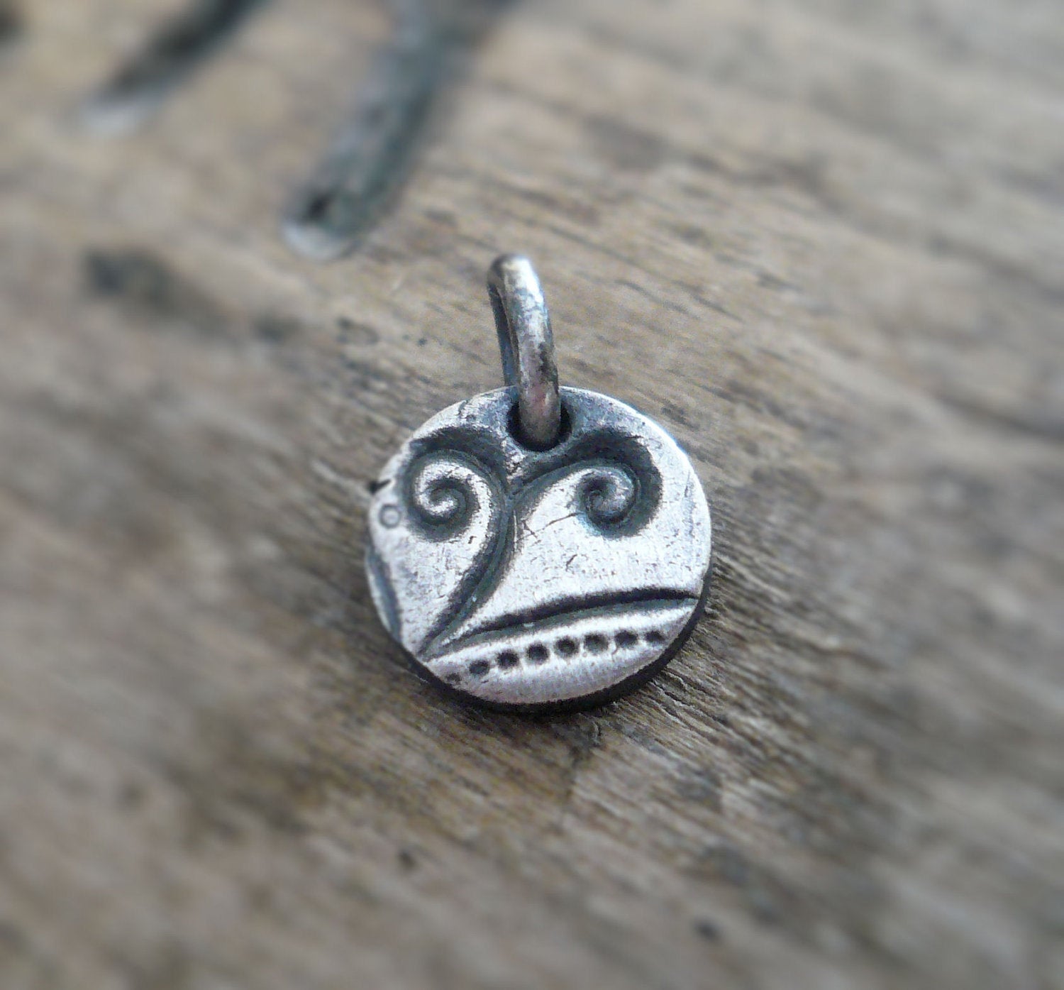 ~8mm fine recycled silver pendant charm completely fabricated by hand by me & imprinted with a swirly frond design. (Fine silver is 99.9% pure silver/ sterling is 92.5% silver w/ the other 7.5% being another metal alloy such as copper)