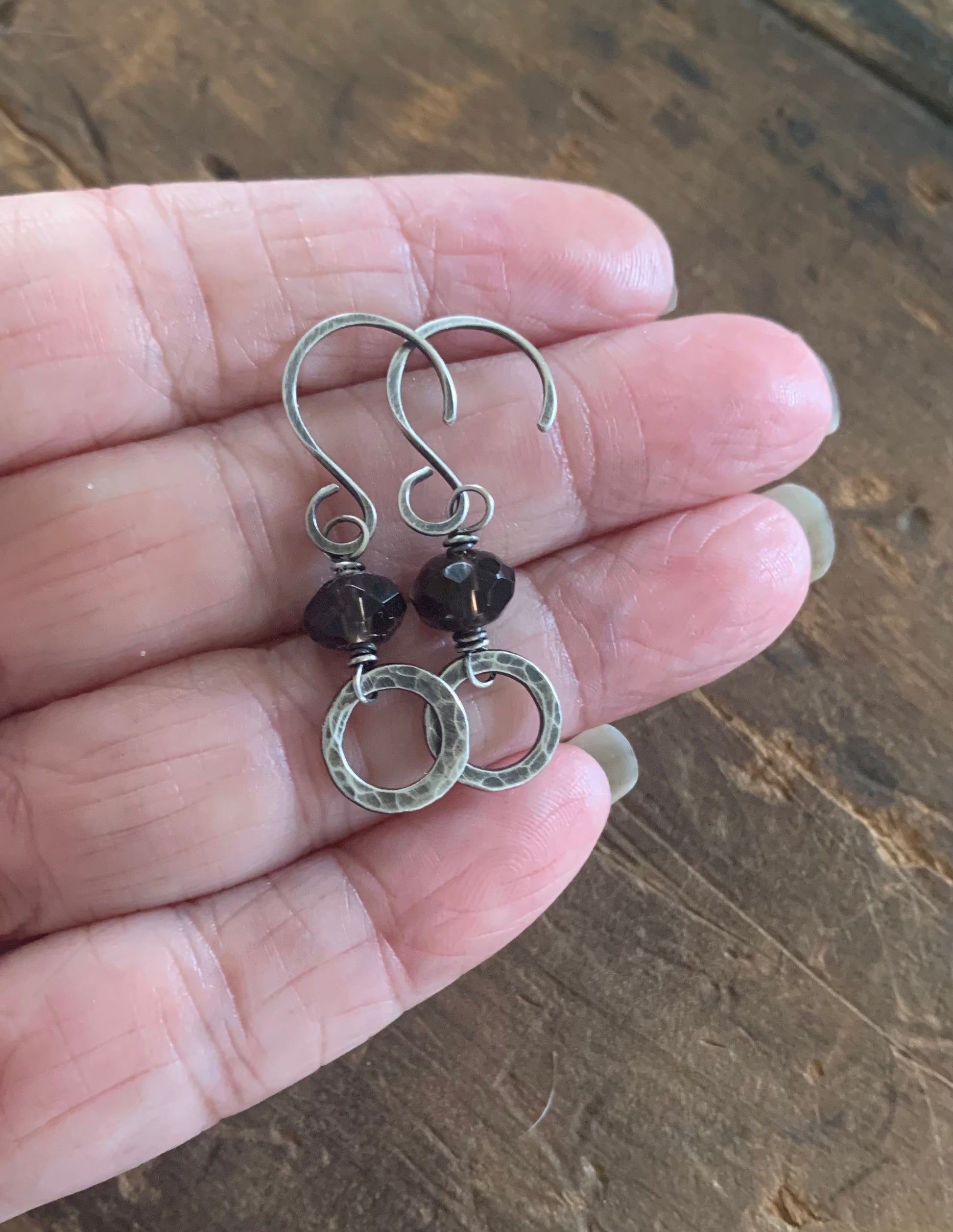 ~6.5mm faceted rondelles of Smoky Quartz dangle 10mm hand forged and hammered loops of sterling. All gracefully dangling from my hand forged earwires. All metal components are high quality sterling silver that have been oxidized, brushed and carefully polished by hand to add a bit of rustic character.