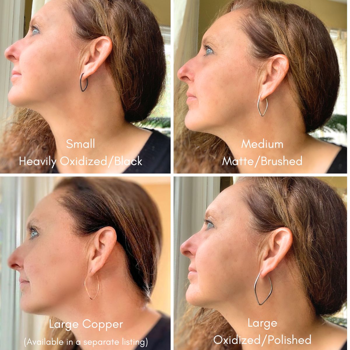 > Thick gauge copper wire has been cut, filed, hand formed & forged into a flattering leaf shape.