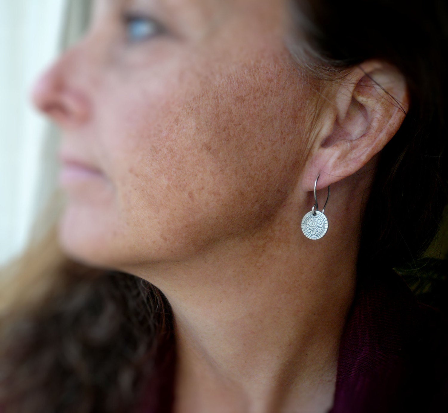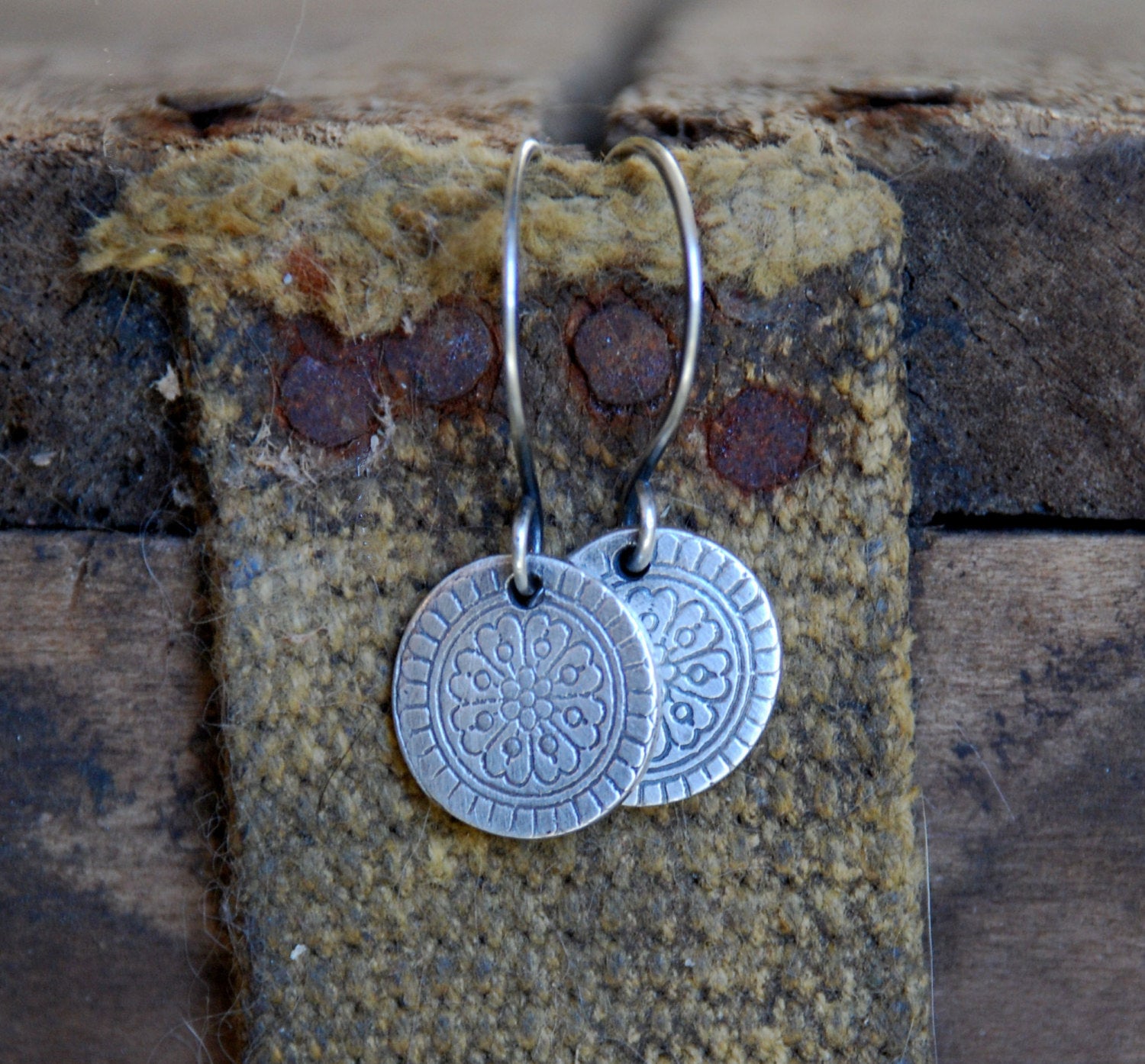 ~13mm or 1/2" rounds of recycled fine silver (99% pure silver/sterling is 92.5% silver) crafted & imprinted by hand by me =).