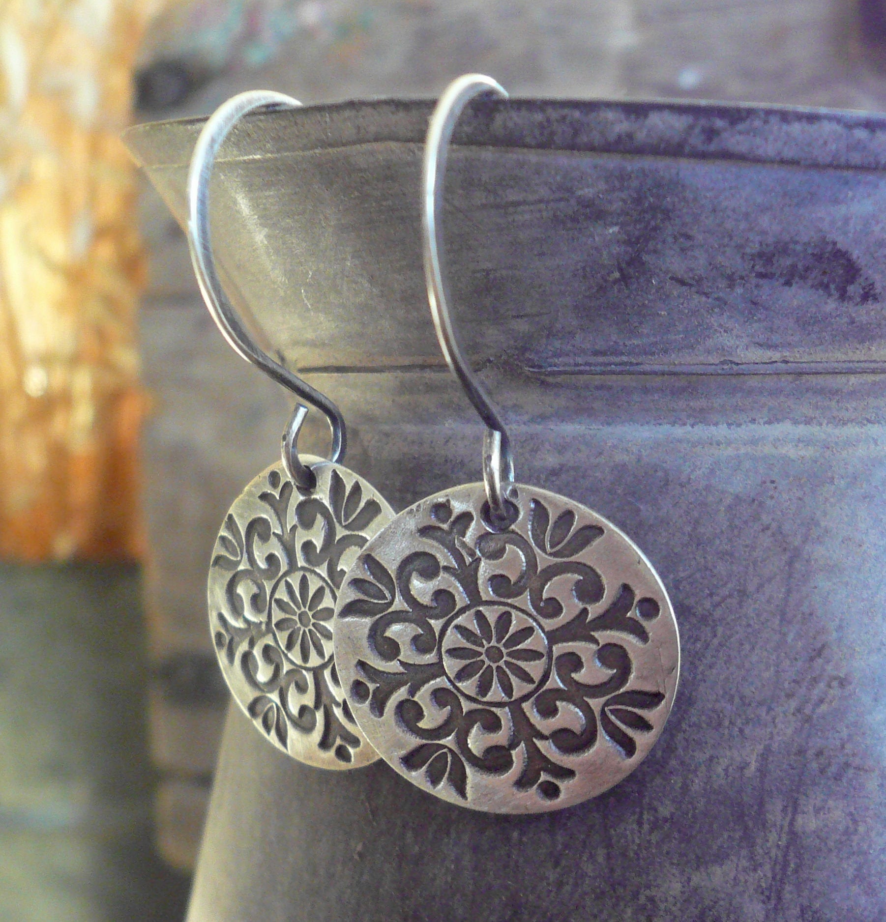 Medallion Earrings Large Style II - Handmade. Oxidized fine and sterling silver