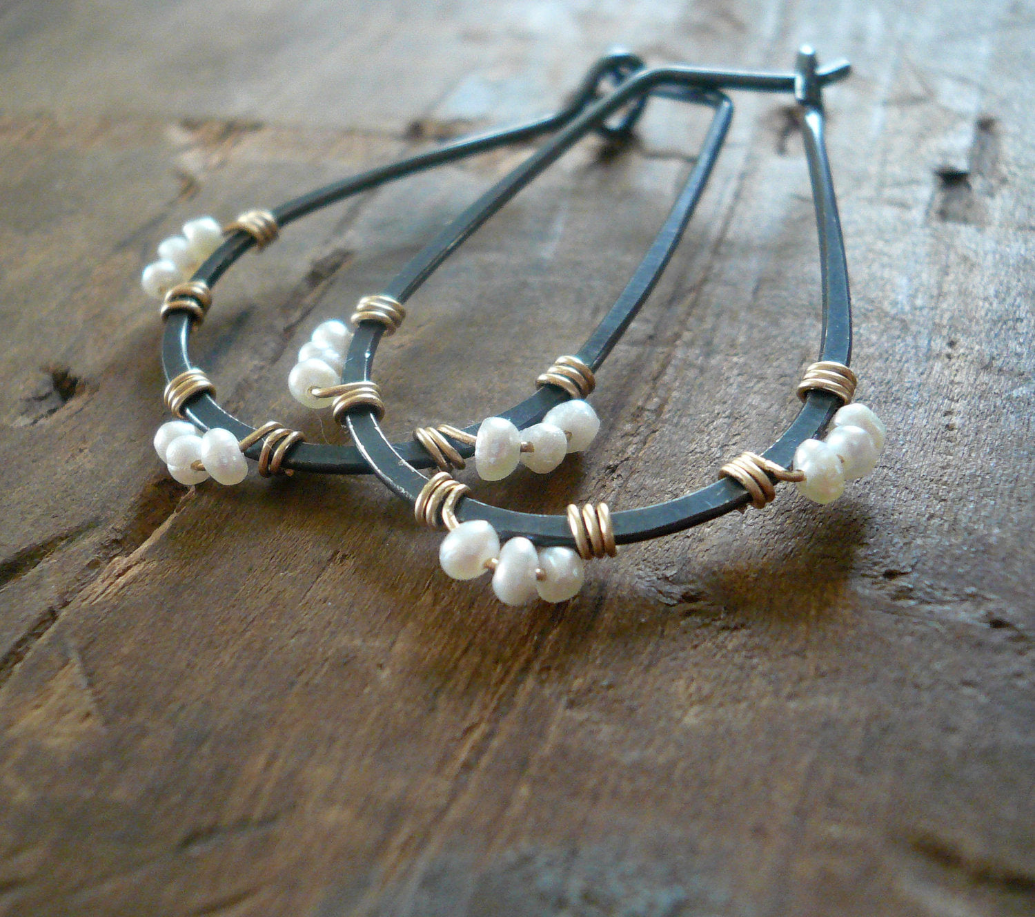 "Medley Hoops" Trios of little snowy white seed pearls are wrapped tidily with gold onto contrasting blackened sterling hoops..
