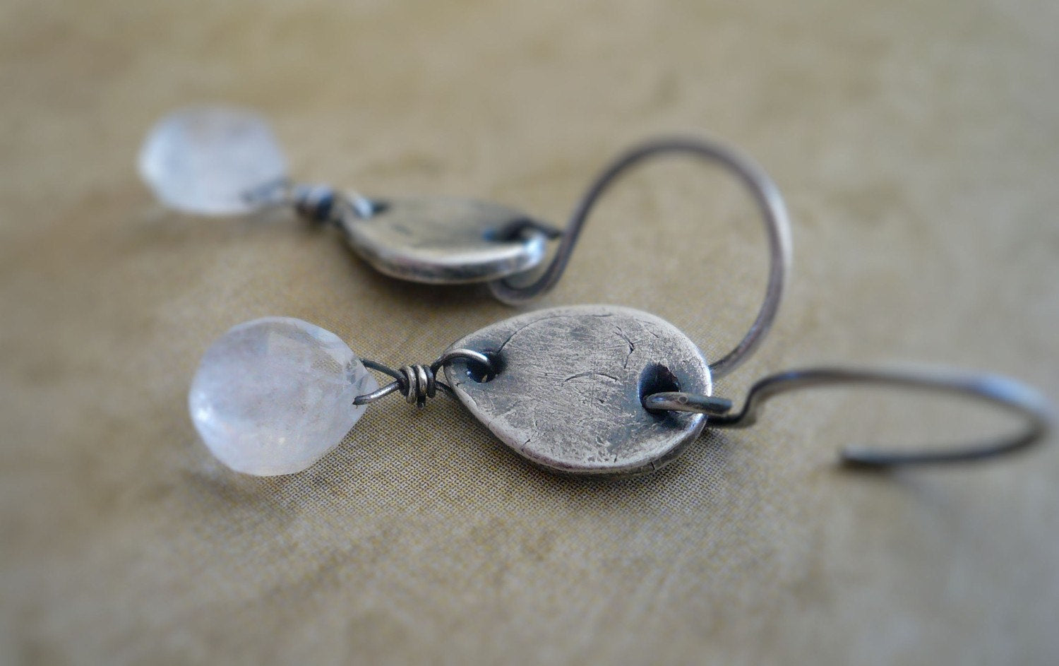 "Blush" Icy gems of Moonstone bashfully dangle from my handcrafted tears of fine silver in this organic but feminine pair of danglies...