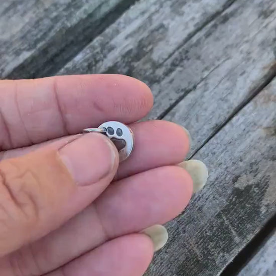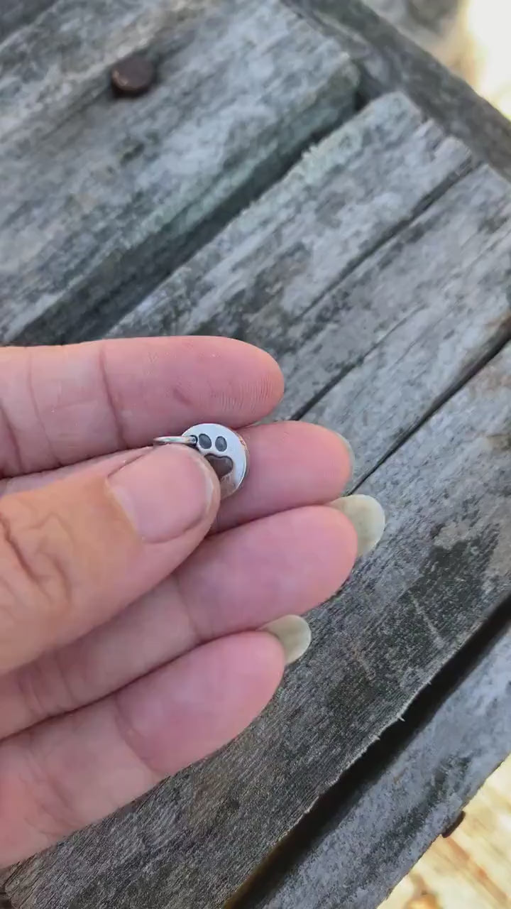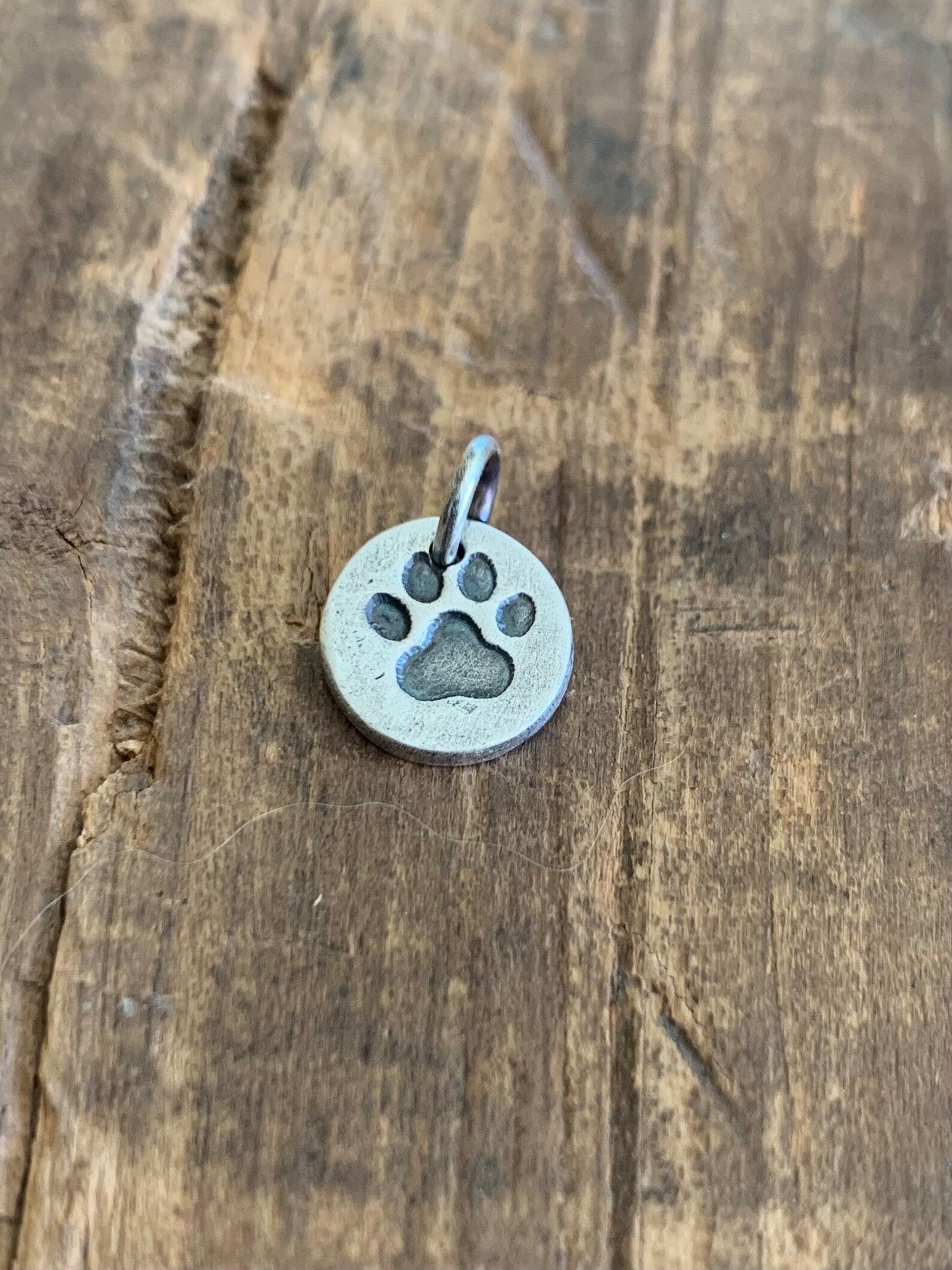 ~10mm fine recycled silver pendant charm completely fabricated by hand by me & imprinted with a little paw print design. (Fine silver is 99.9% pure silver/ sterling is 92.5% silver w/ the other 7.5% being another metal alloy such as copper)