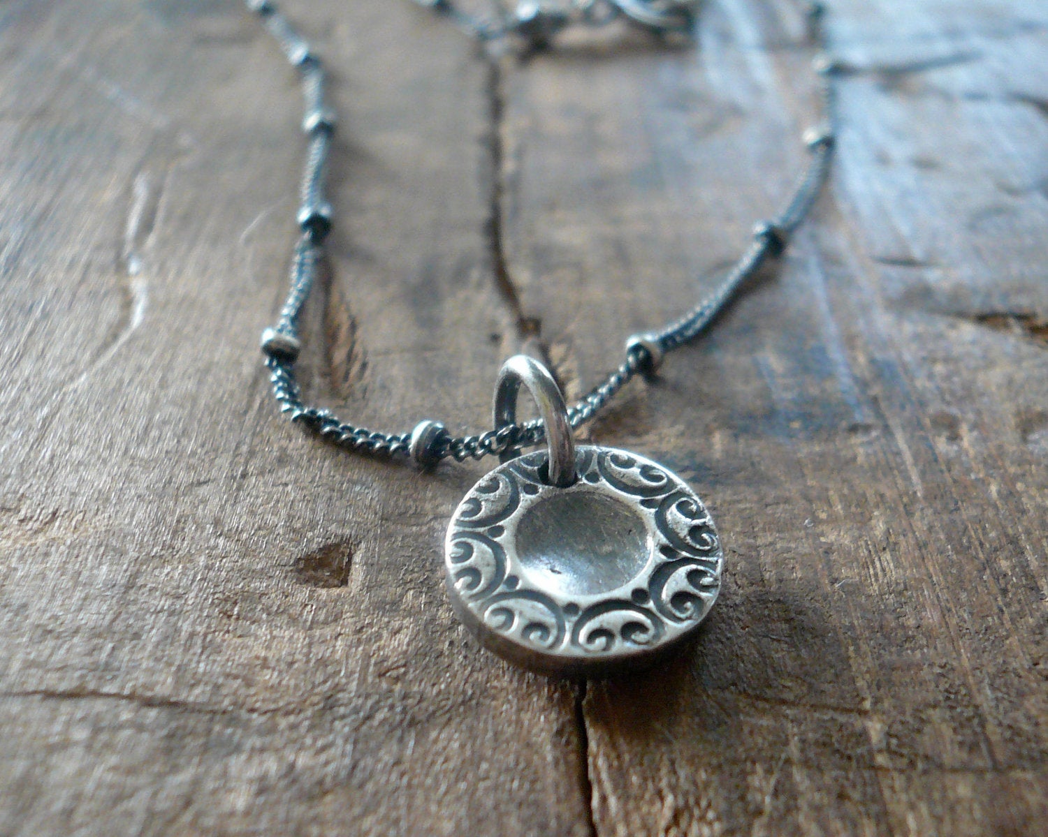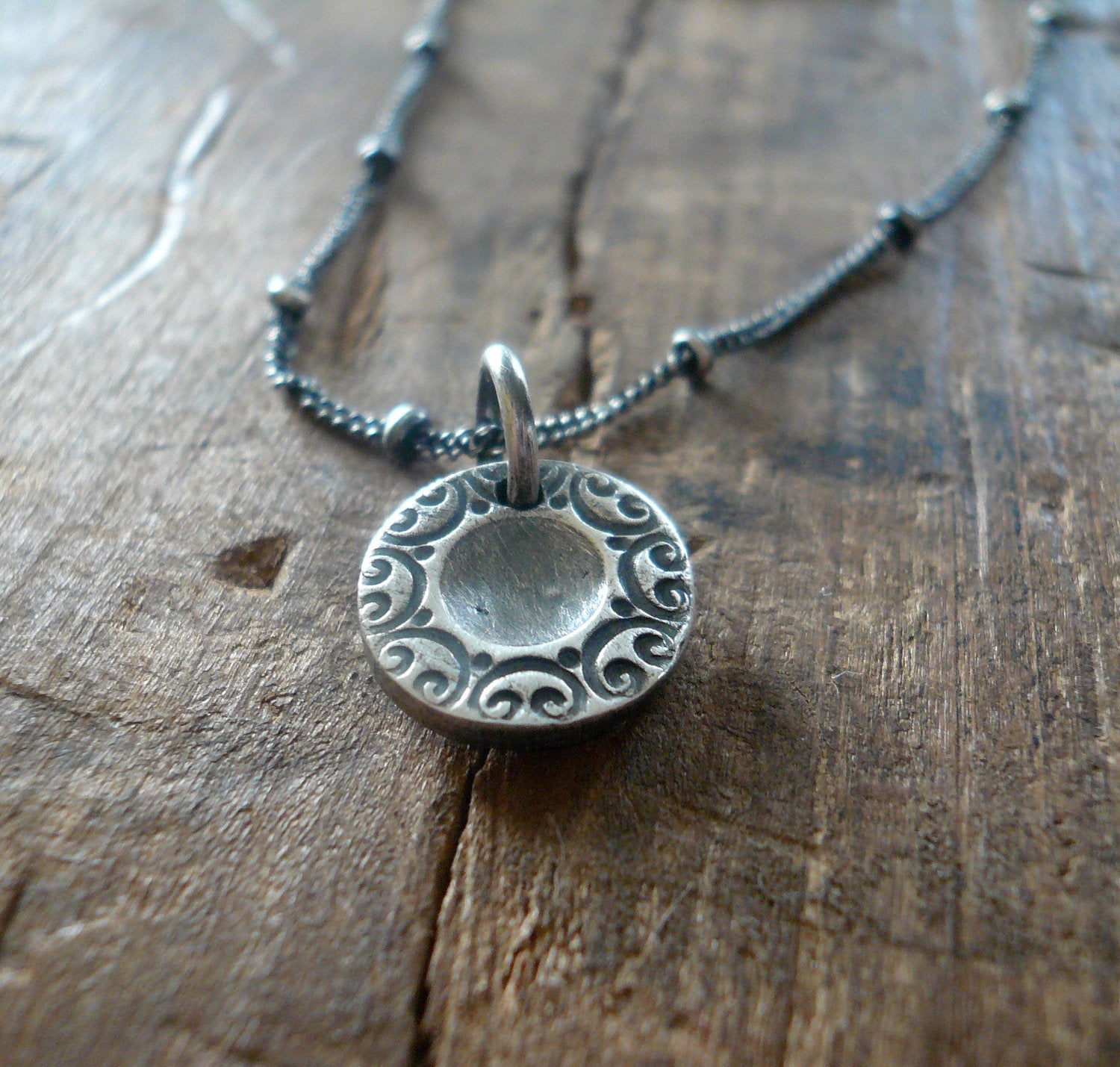 ~10mm round of recycled fine silver (99% pure silver/sterling is 92.5% silver) crafted & imprinted from old antique buttons by hand by me. As I construct each one entirely by hand sizes are approximate.