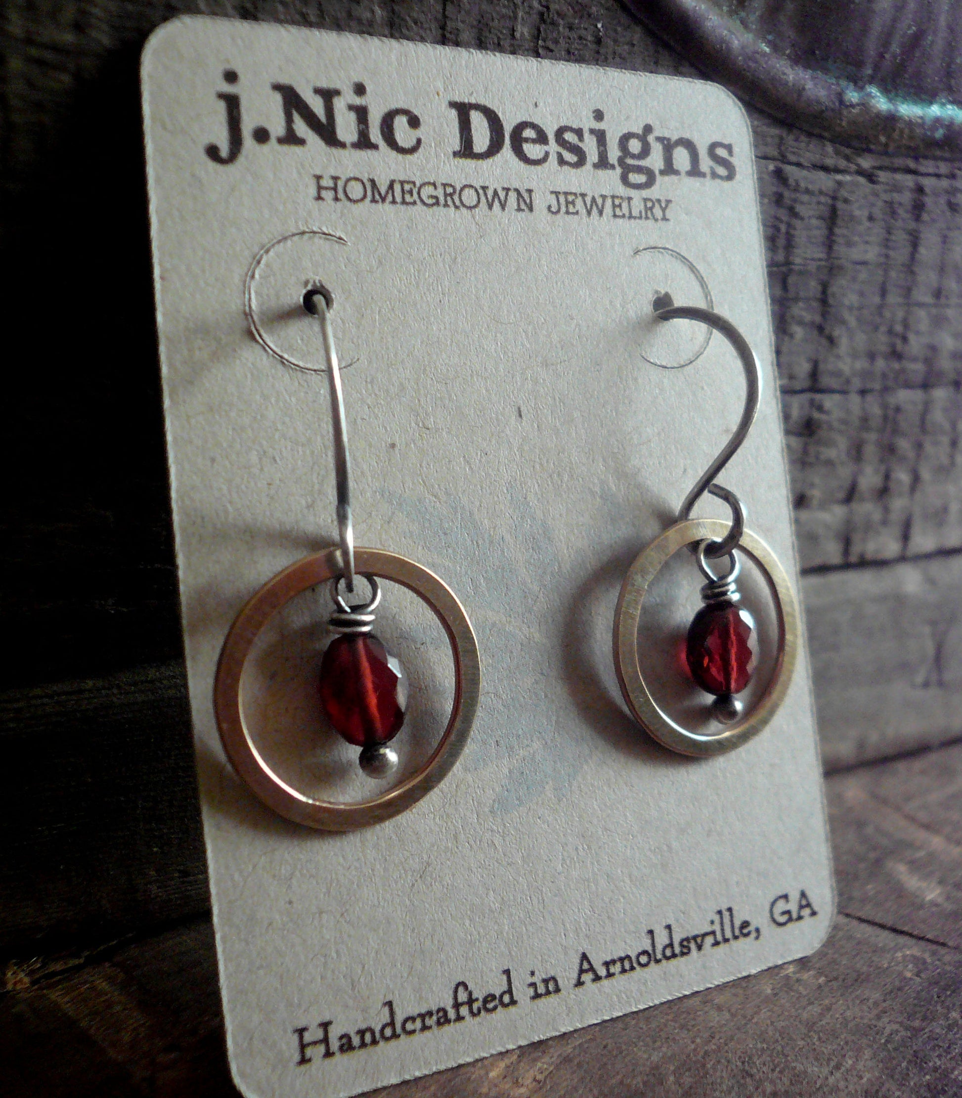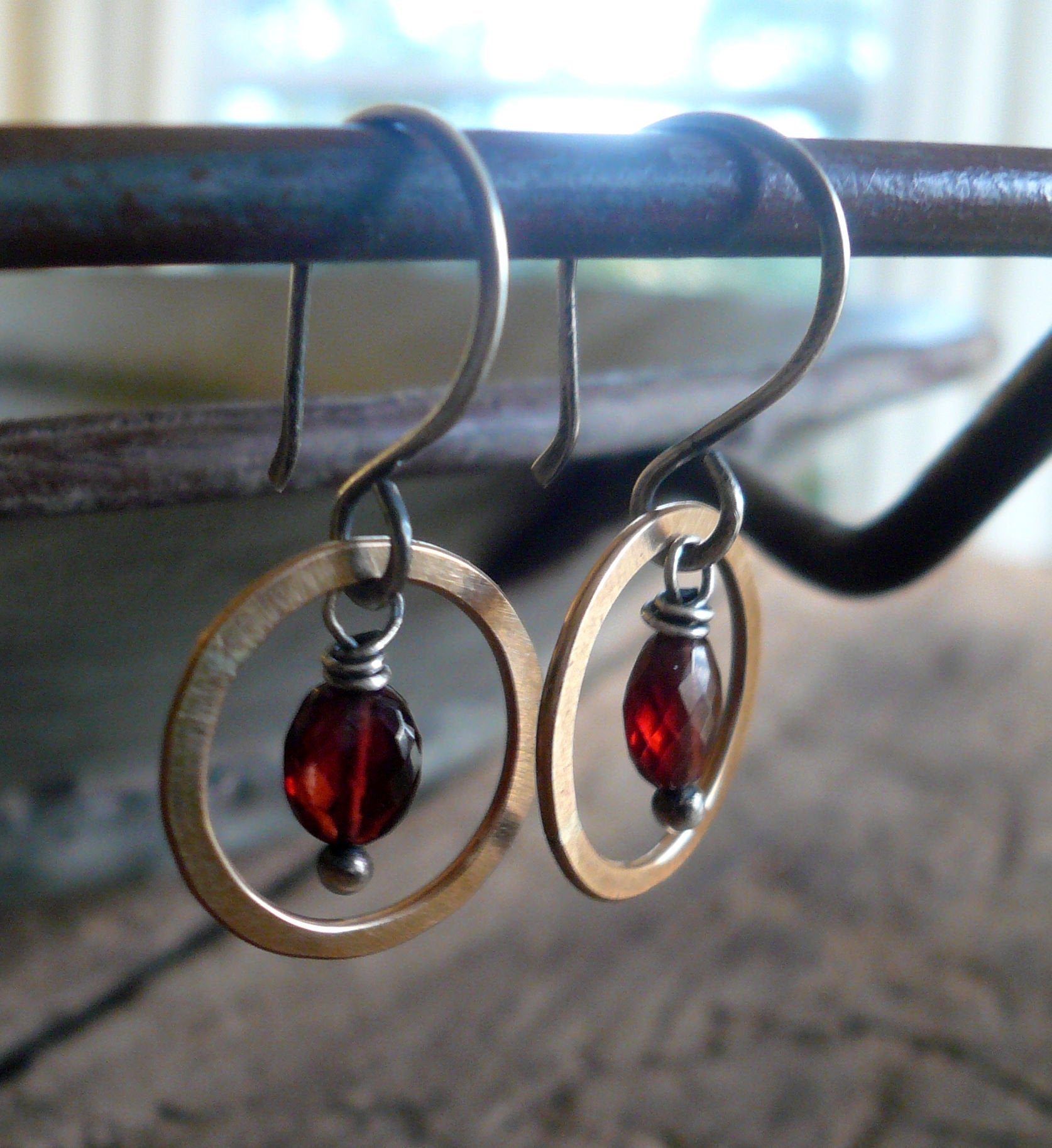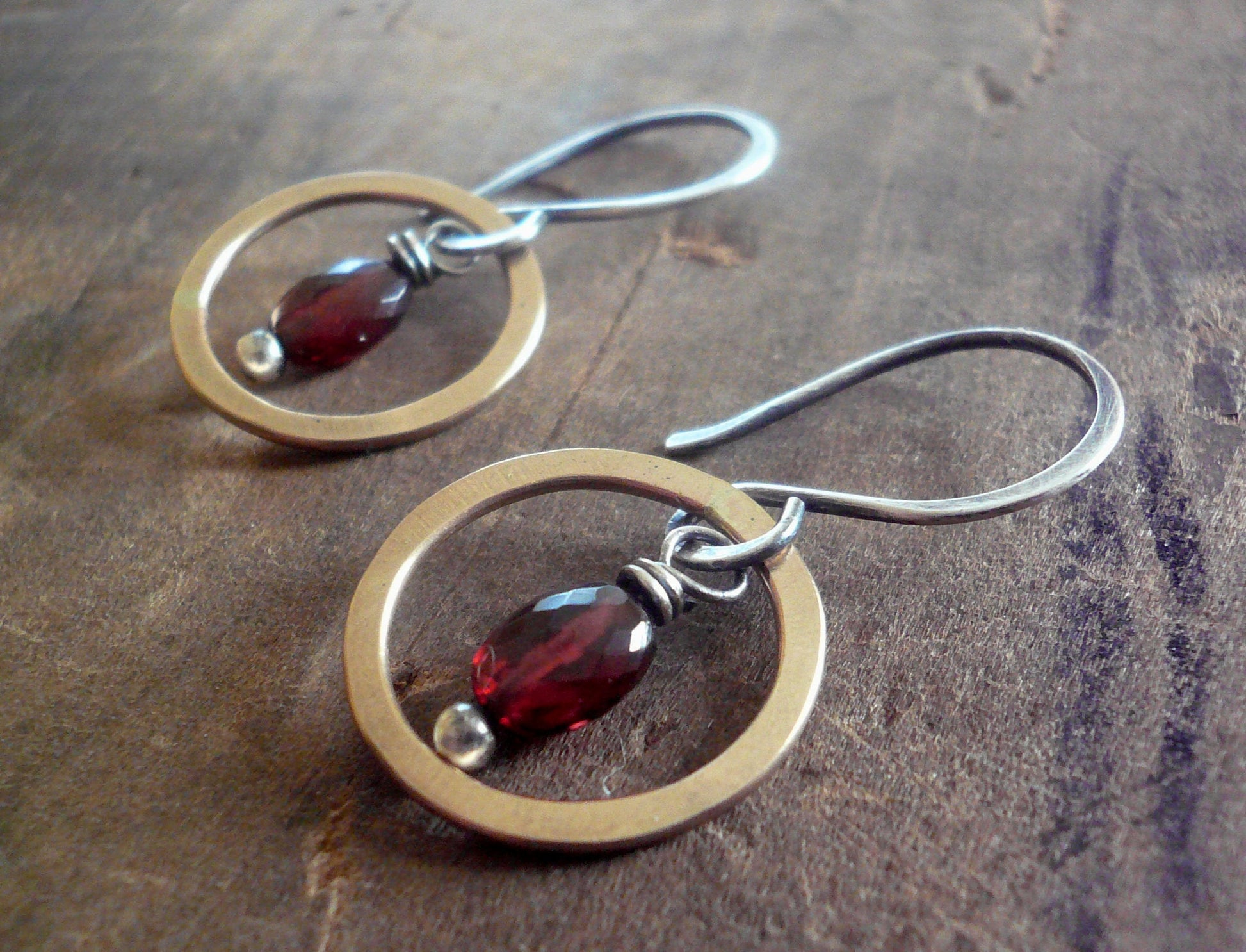Rouge Collection Dangle Earrings - Handmade. Garnet. Mixed Metals. Oxidized Sterling silver & 14 kt Goldfill birthstone Earri