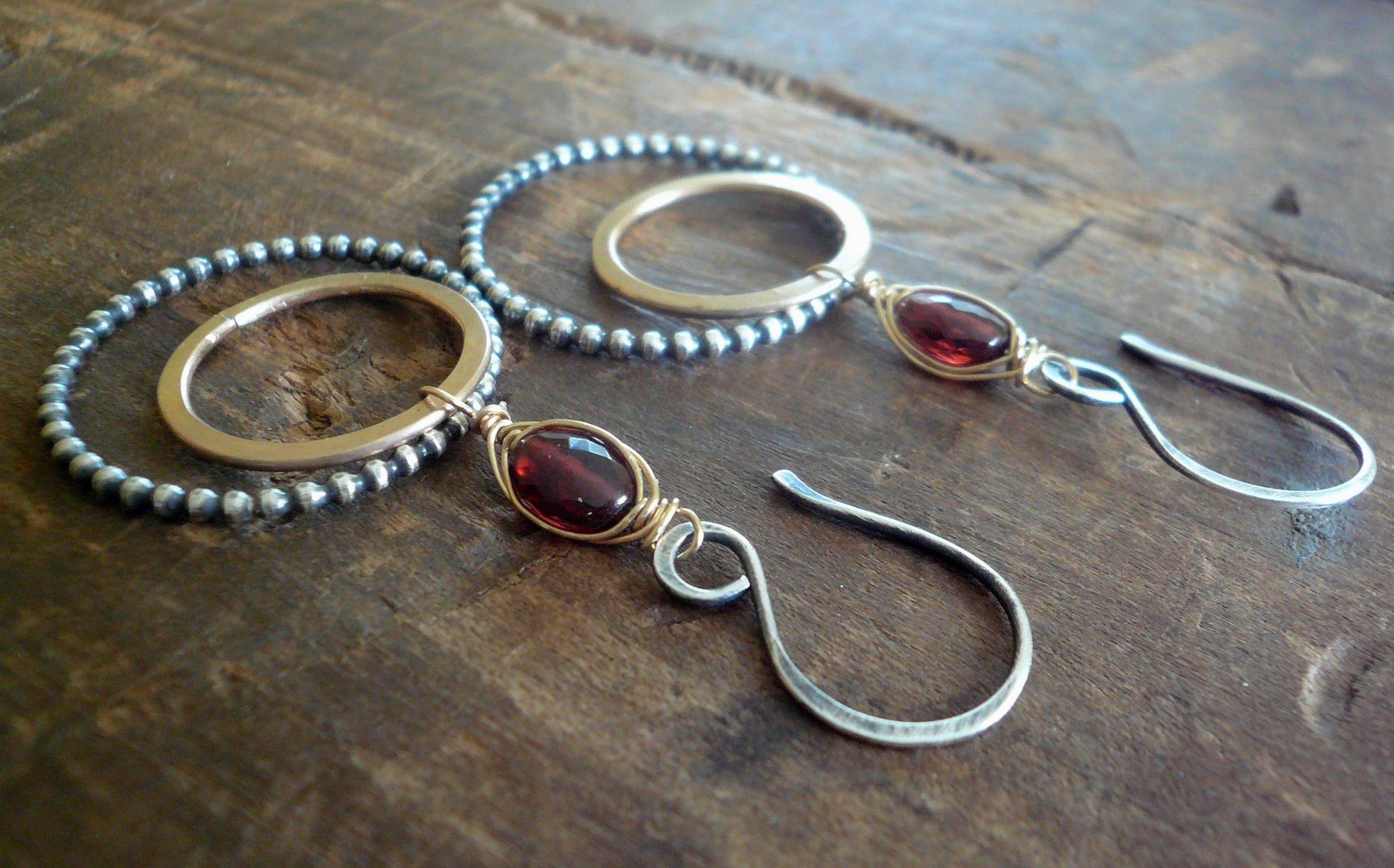 Rouge Collection Wrap Earrings - Handmade. Garnet. Mixed Metals. Oxidized Sterling silver & 14 kt Goldfill dangle birthstone Earrings