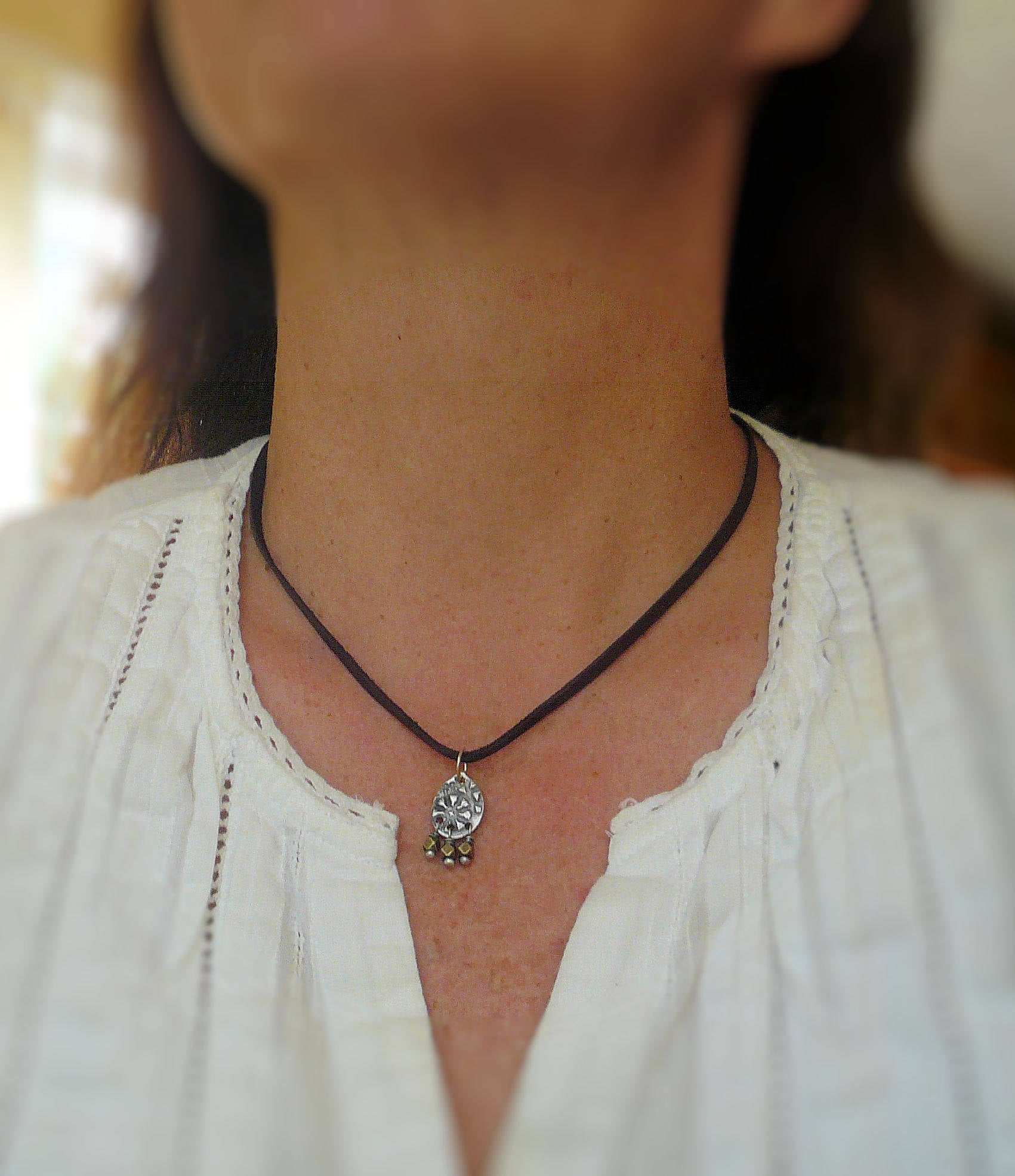 An oxidized patina was added layer by layer to the pendant then carefully removed by brushing & polishing by hand to add depth to the design & a bit of rustic appeal.