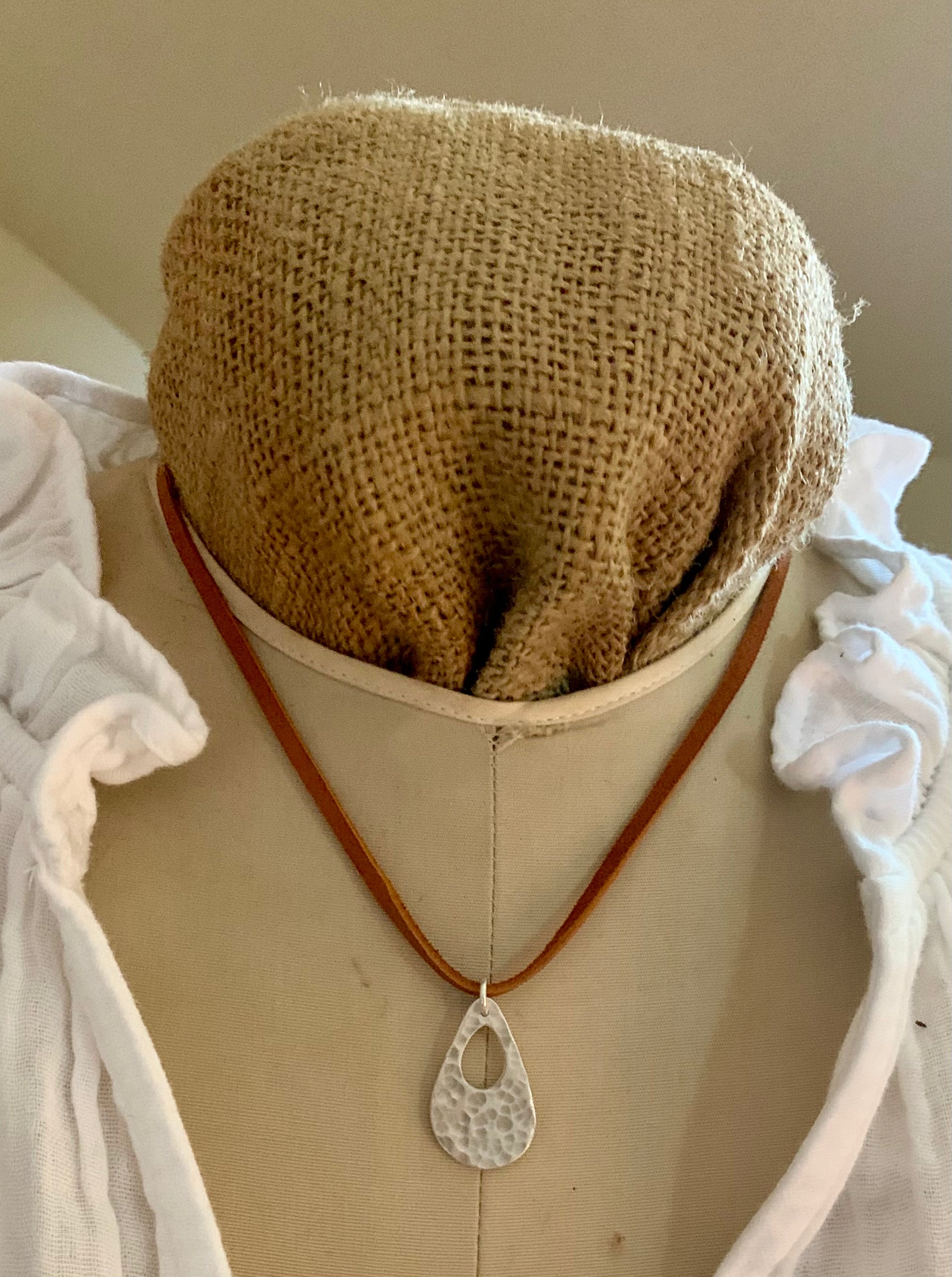 Minutiae Necklace - Fine & Sterling Silver. Leather. Handmade. Hammered Tear Drop Pendant
