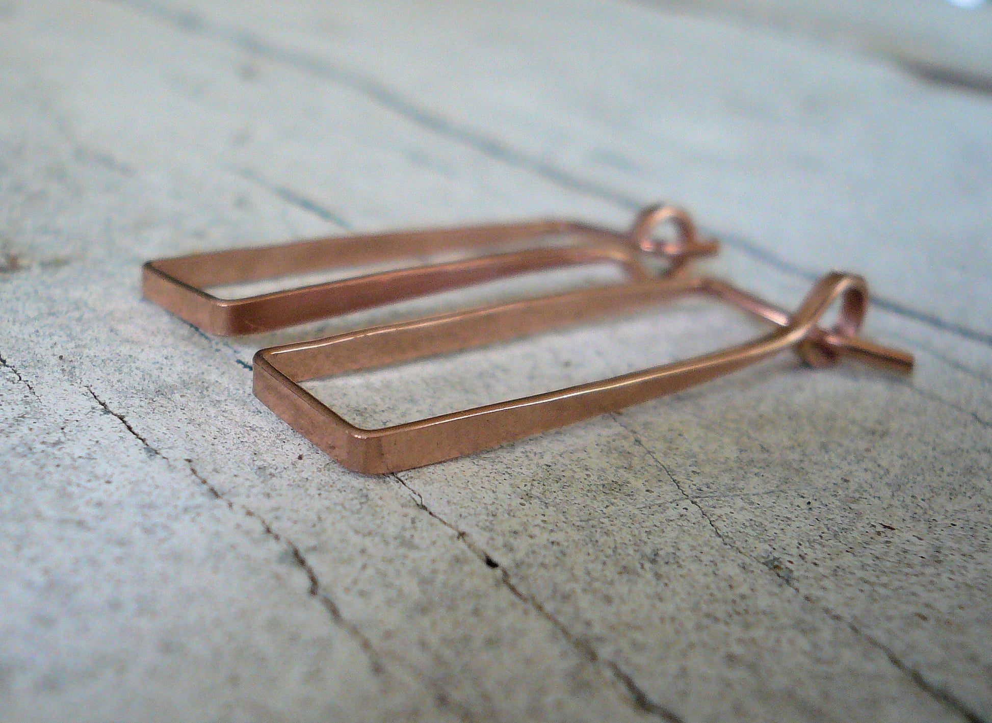 18 gauge 14kt Rose goldfill wire has been cut, filed, forged in different directions to add dimension & then formed into a long, lean rectangular shape.