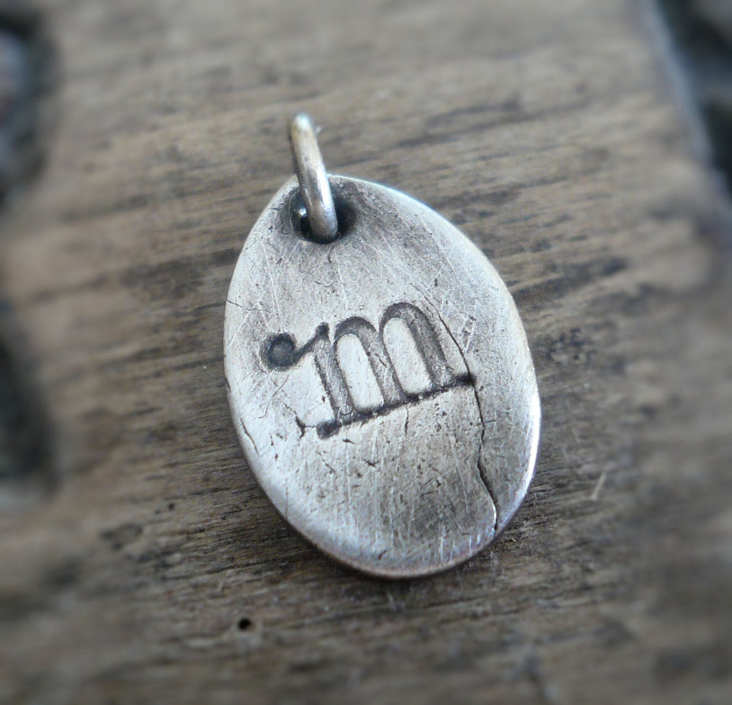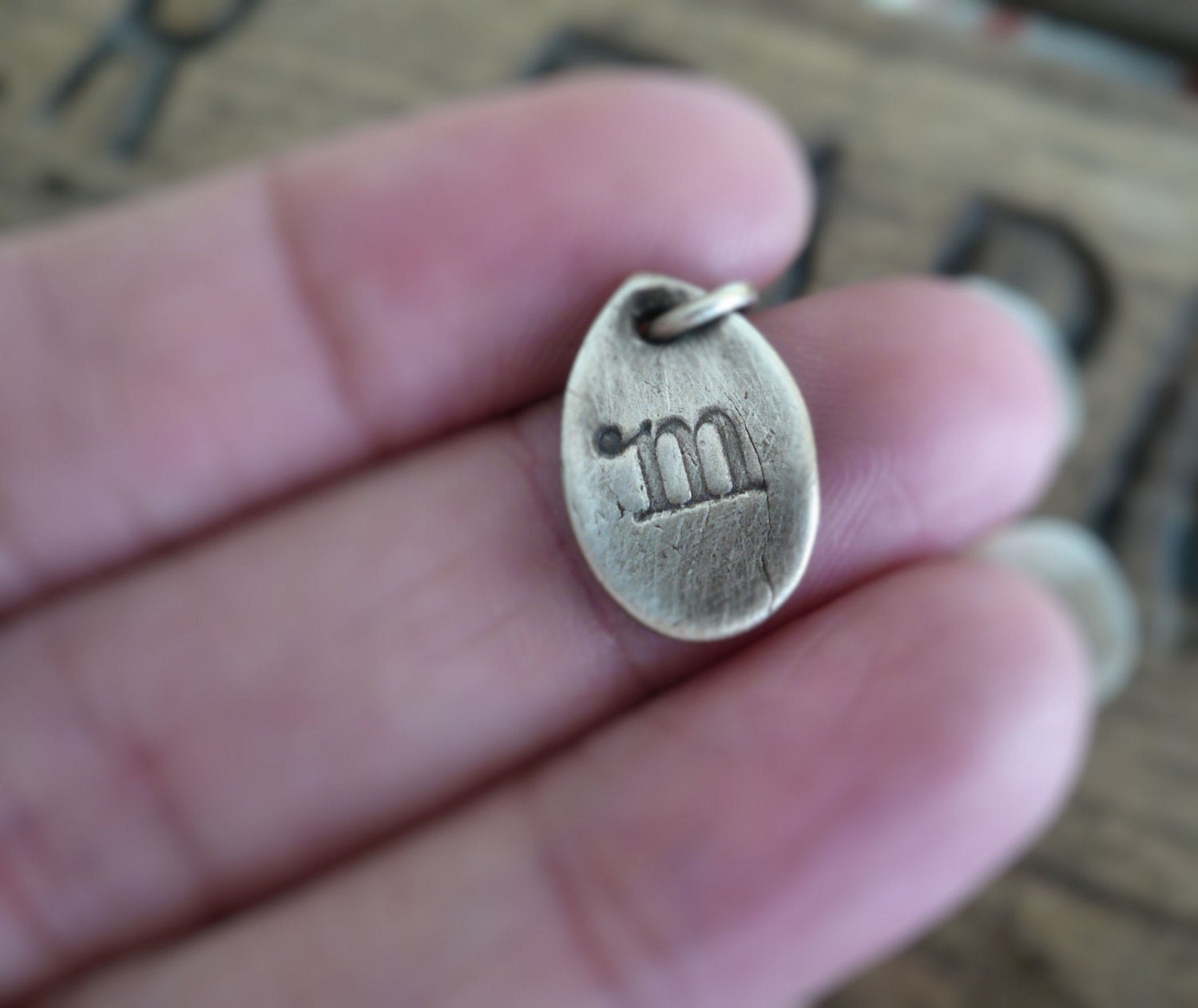 ~13-15mm x 8-10mm fine recycled silver (99.9% pure silver/ sterling is 92.5%) pendant tear drop charm completely fabricated by hand by me and imprinted with the letter or number of your choice.